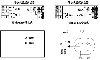 對(duì)導(dǎo)軌式溫度變送器輸入可以是熱電偶、熱電阻、標(biāo)準(zhǔn)信號(hào)。工作電源接端子1、24~20mA輸出信號(hào)接3正、4負(fù);對(duì)二線制4~20mA輸入信號(hào)正接5、負(fù)接6;熱電阻單端A5、并聯(lián)端B、C分別接6、7。