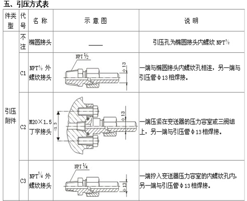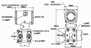 例:TDSB3051差壓變送器,量程0-300kpa,兩線制4~20 mA DC信號(hào)輸出,法蘭接頭排氣/排液閥、隔離膜片均為316不銹鋼智能表顯示器,管裝平支架,泄放閥在壓力室側(cè)面的橢圓接頭內(nèi)螺紋NPT 1/2