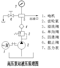 電動(dòng)機(jī)通過聯(lián)軸器直接帶動(dòng)齒輪泵泵油,壓力油經(jīng)過溢流閥調(diào)節(jié)通往單向閥到達(dá)四通集成塊,分別供給壓力表、調(diào)節(jié)截止閥和用油對(duì)象供油;